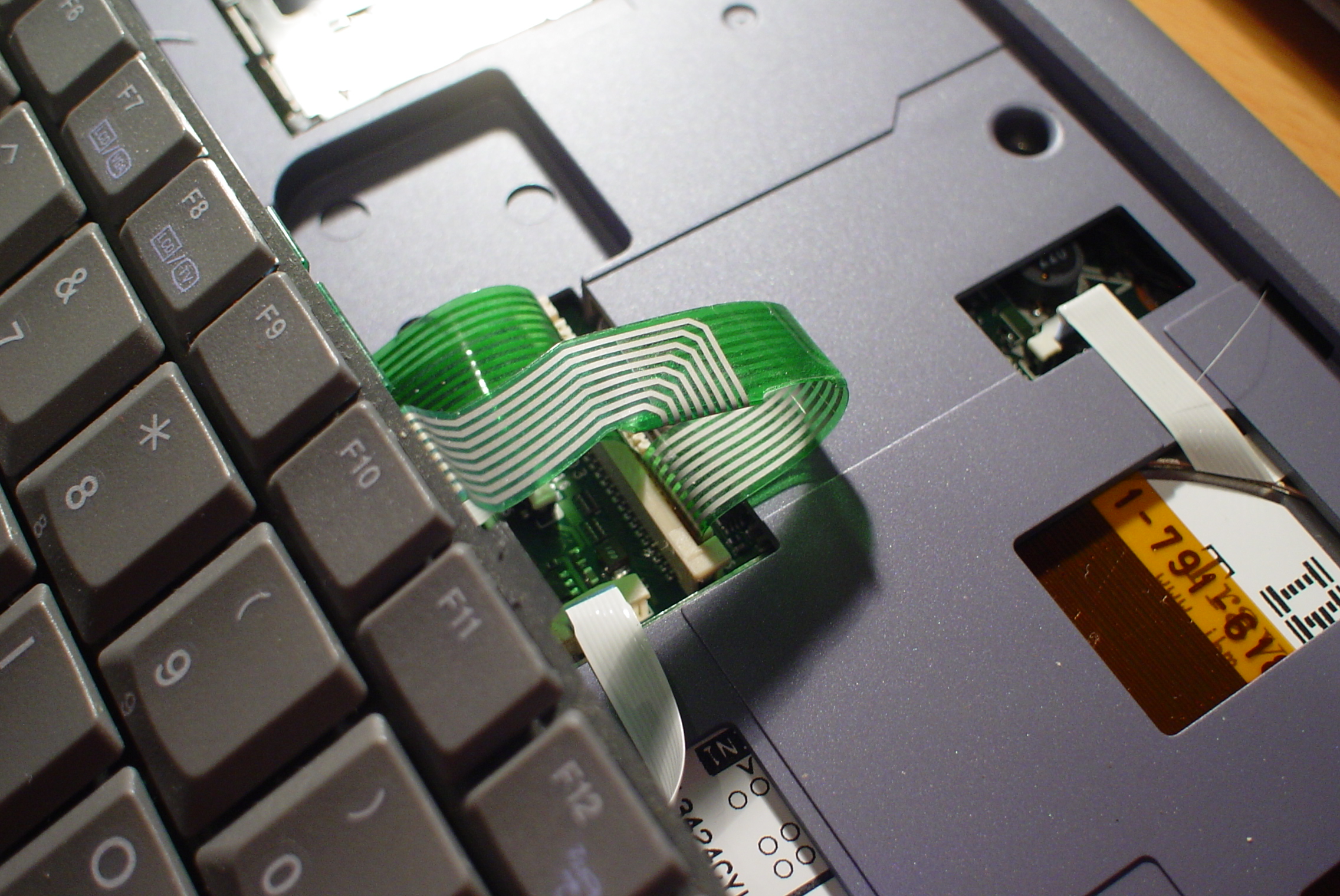 - Be careful removing the keyboard. Underneath it, there is a ribbon cable connecting it and the mouse nub to the motherboard.